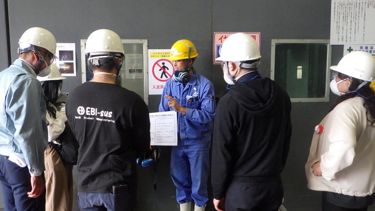 さらに工場見学では、泉北工場が保有する多様な溶射設備をご紹介。実際の溶射のフレームの勢いや音の迫力を体感しながら、それぞれ特徴の異なる各設備にちなんだクイズにも挑戦していただき、楽しみながら溶射への理解を深めていただきました。