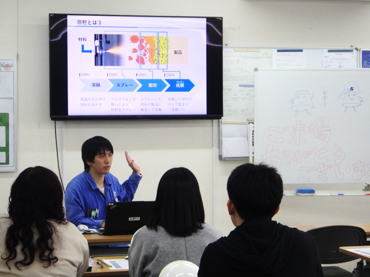 当日は、泉北工場の主力技術である 「溶射」 についてご説明。普段の生活では耳にしない専門用語も多く、参加者の皆さまから多くの関心をいただきました。